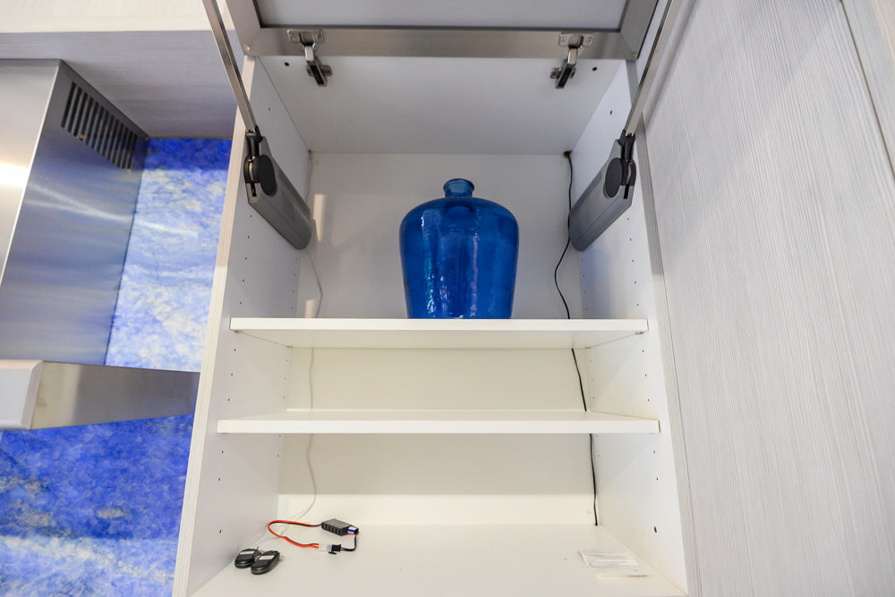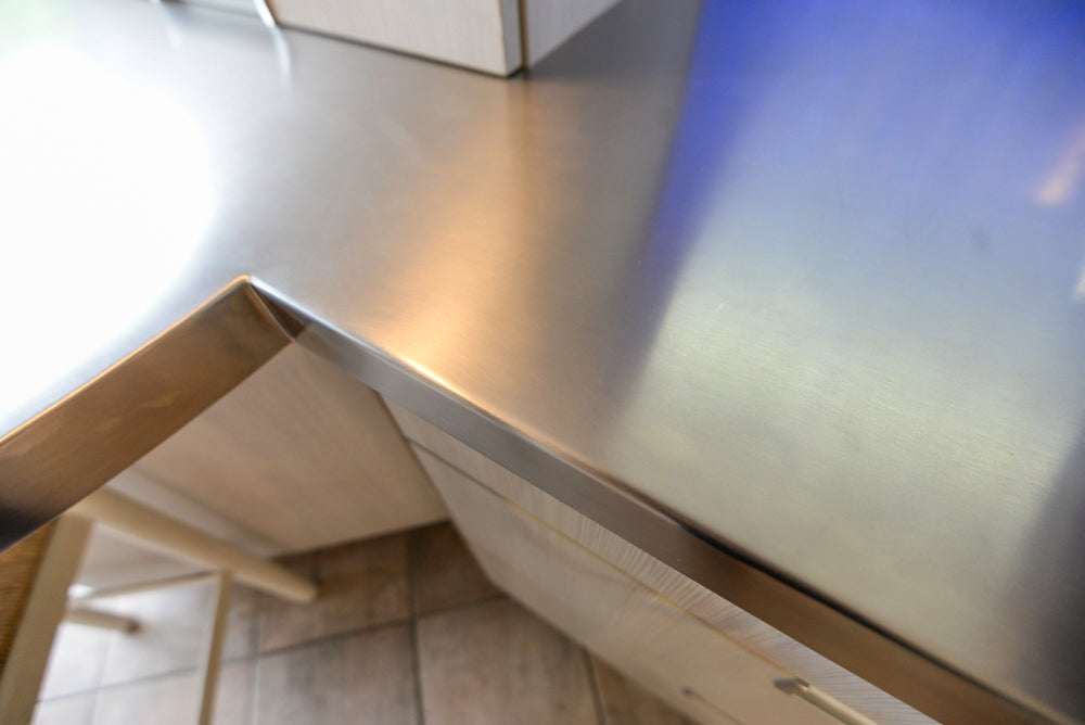 Complementing the modern aesthetic, the stainless steel countertops bring a bold, industrial edge to the design. Their sleek, reflective surface not only enhances the visual appeal of the space but also provides a durable, easy-to-maintain workspace that resists scratches, heat, and stains. Whether you're preparing meals, entertaining guests, or simply enjoying your space, the stainless steel countertops are designed to withstand the demands of daily life while offering a sophisticated, high-tech feel.