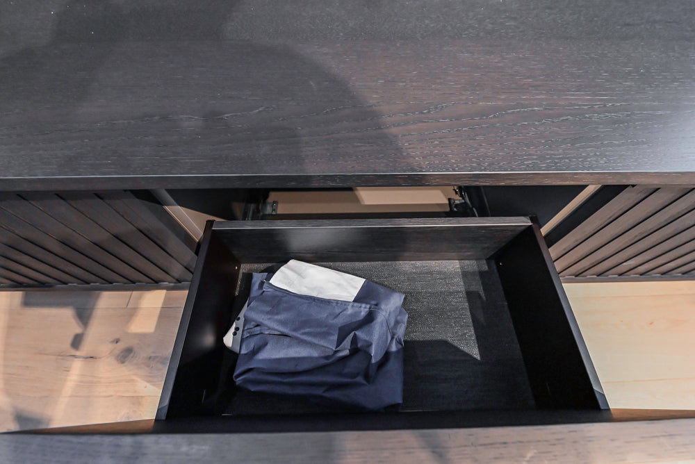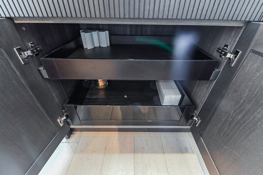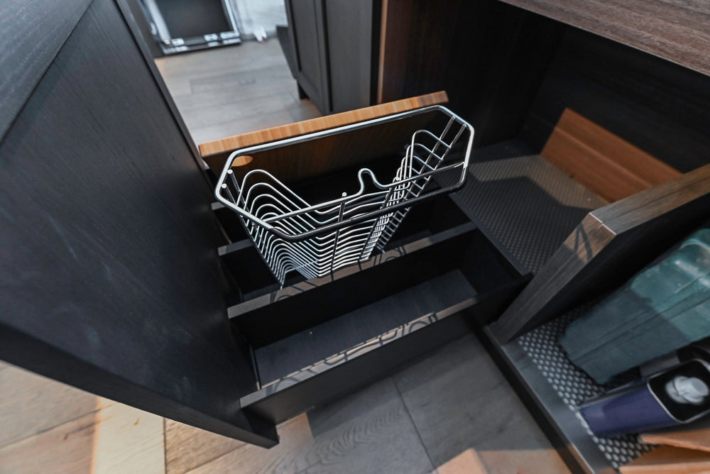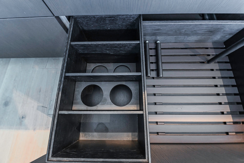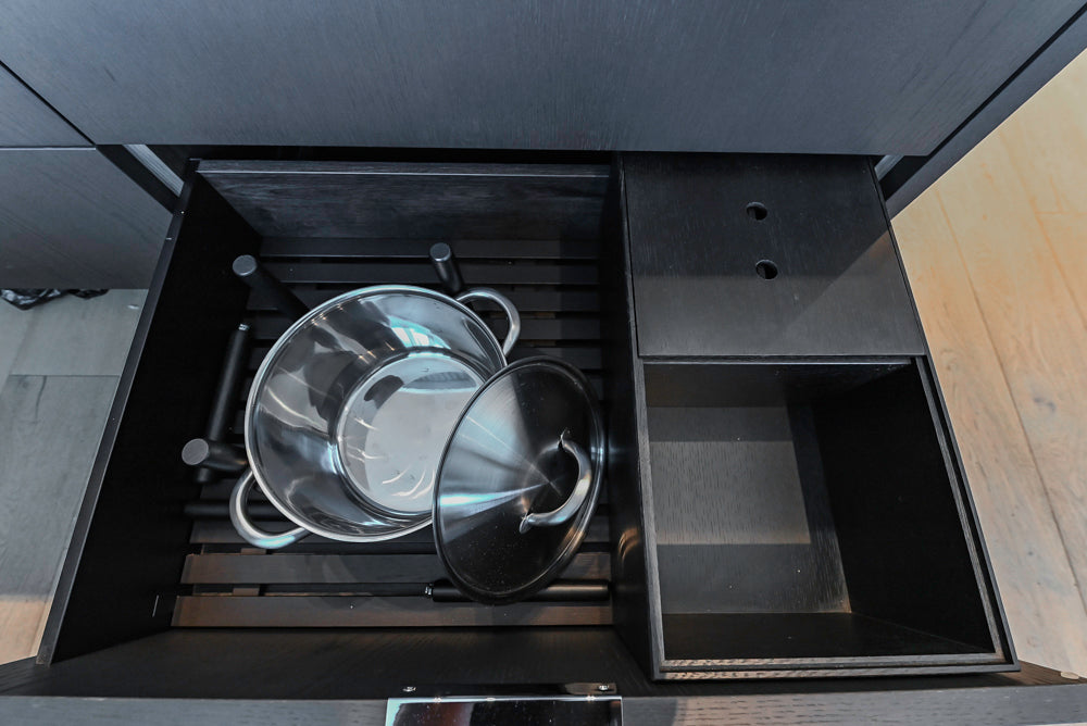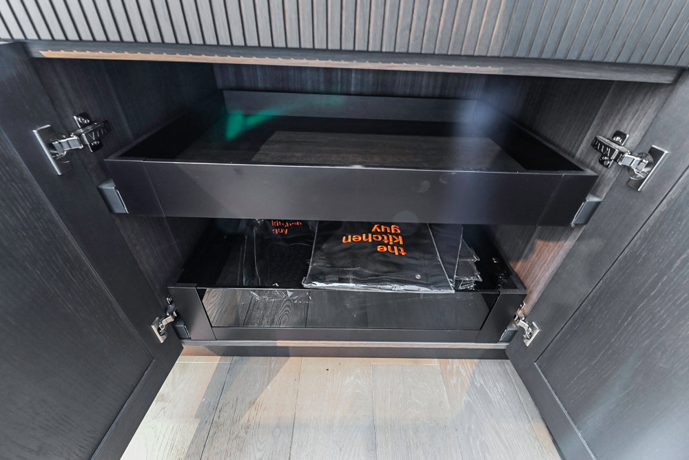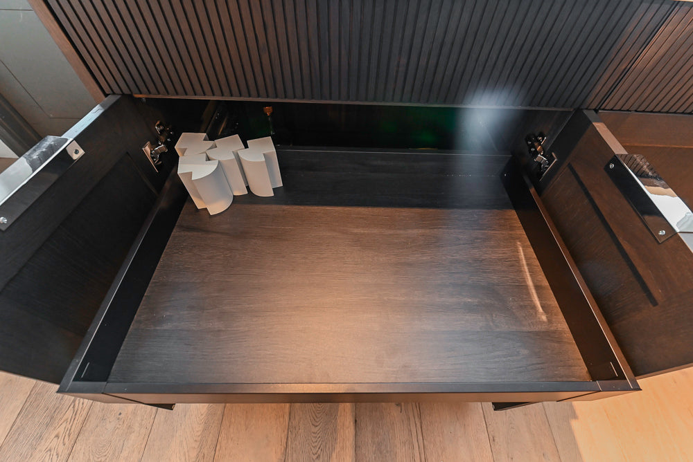 This DOCA Modern Classic Kitchen blends timeless warmth with sleek modern lines, featuring elegant brown wood veneer cabinetry and ultra-durable Neolith countertops. The refined grain of the veneer adds organic texture, while the minimalist design and high-performance surfaces make it as functional as it is beautiful.