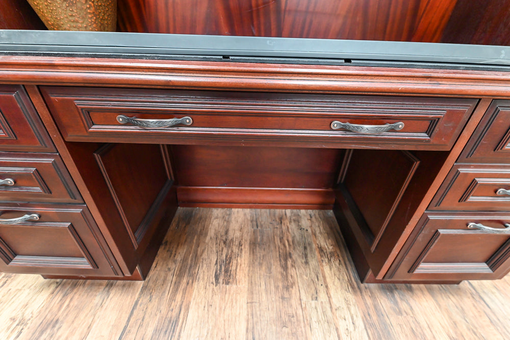 Crafted with stunning attention to detail, this sophisticated piece combines the rich, deep tones of classic brown cabinetry with the charm of a built-in fireplace, creating a cozy yet refined atmosphere in any room.