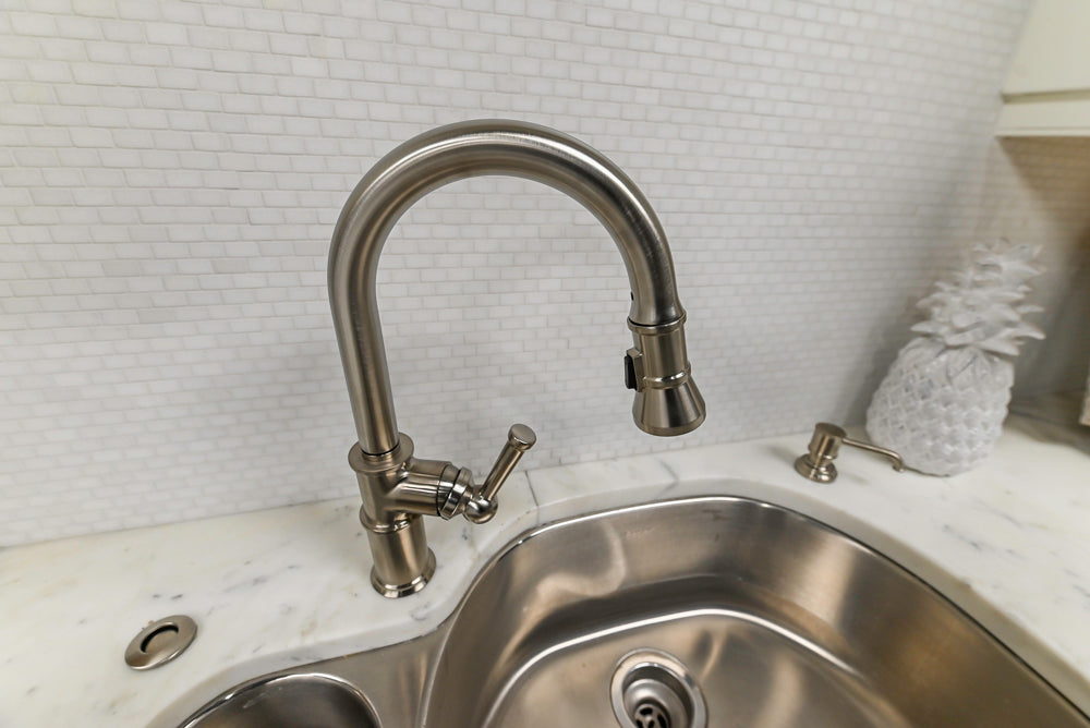 At the heart of this kitchen are the white marble countertops, adding a luxurious and durable surface that enhances the space with their natural beauty and unique veining. These countertops are not only visually stunning but also practical, providing ample space for meal prep, entertaining, and everything in between.