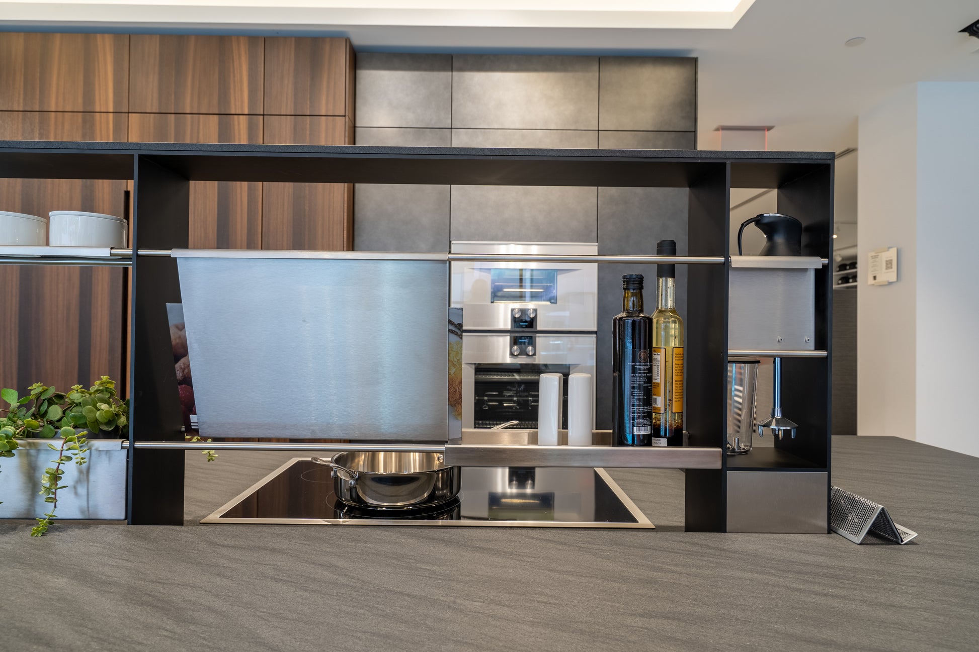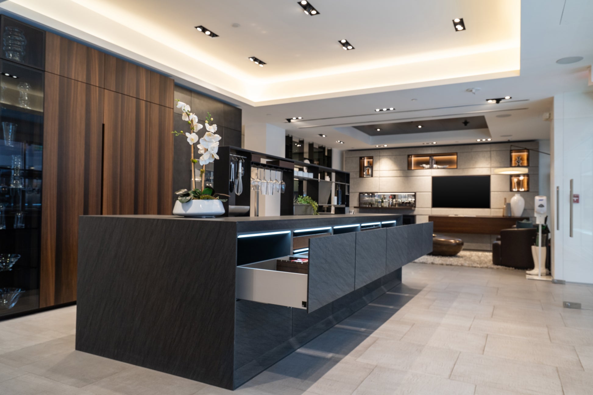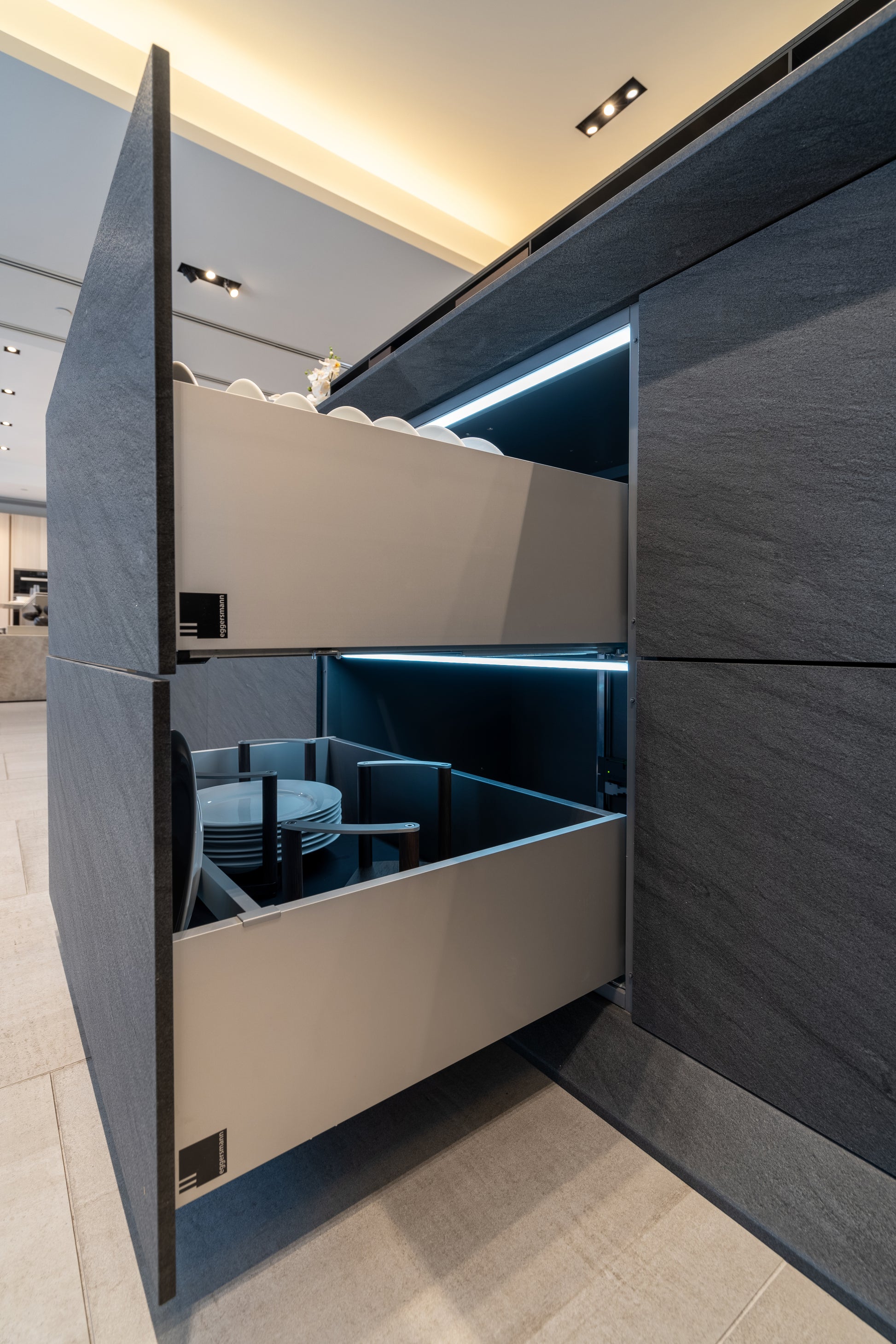 Sculptural elegance meets cutting-edge functionality in this eggersmann modern kitchen, featuring a refined mix of Glance Glass surfaces, a dramatic Carbono stone island, and rich Smoked Oak cabinetry. Designed with precision and intention, every element is crafted to elevate both form and performance.