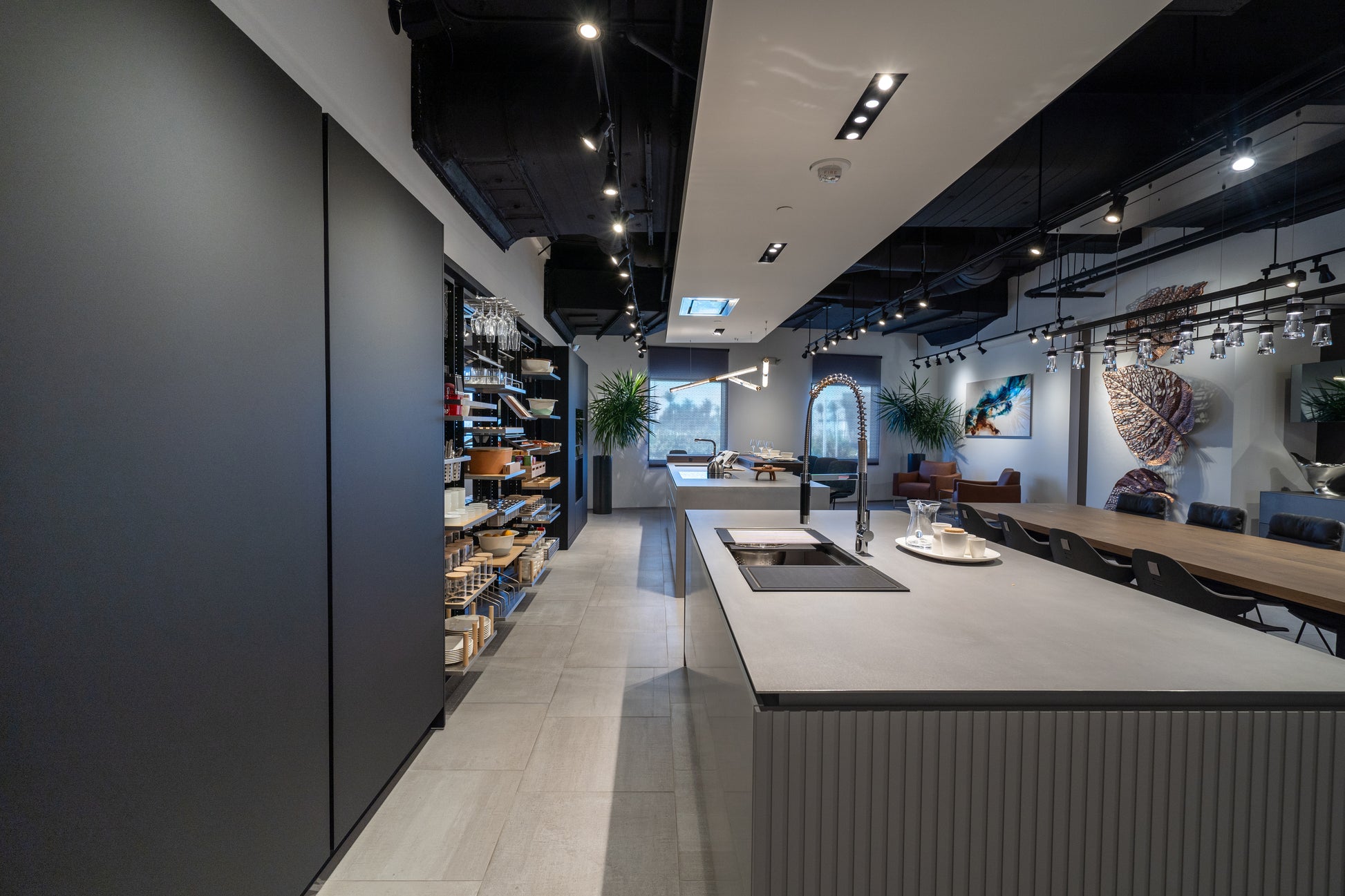 eggersmann USA Modern Light Ash Showroom Kitchen with Island, Miele Appliances & Dekton Keon Countertops