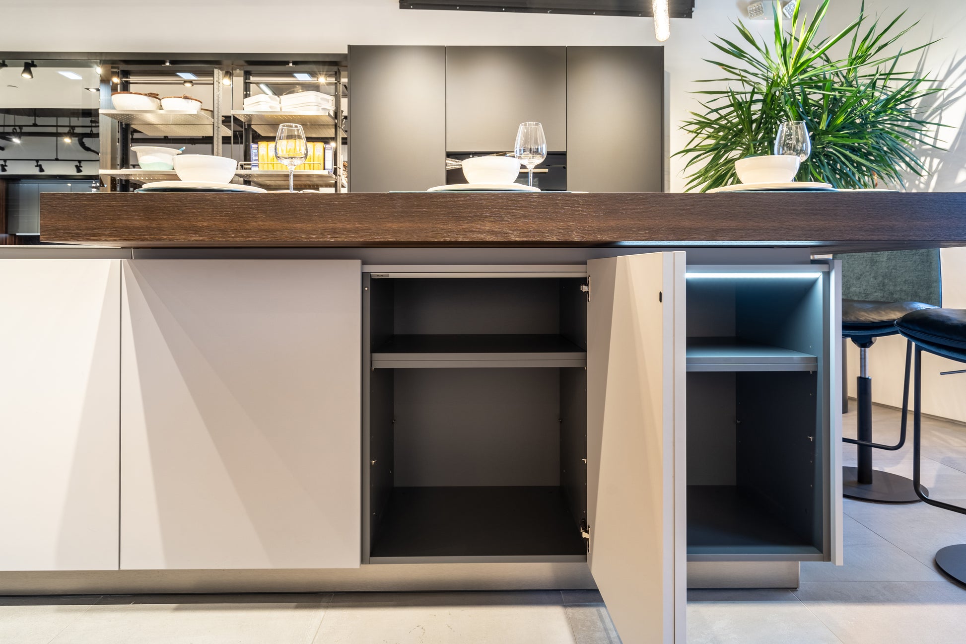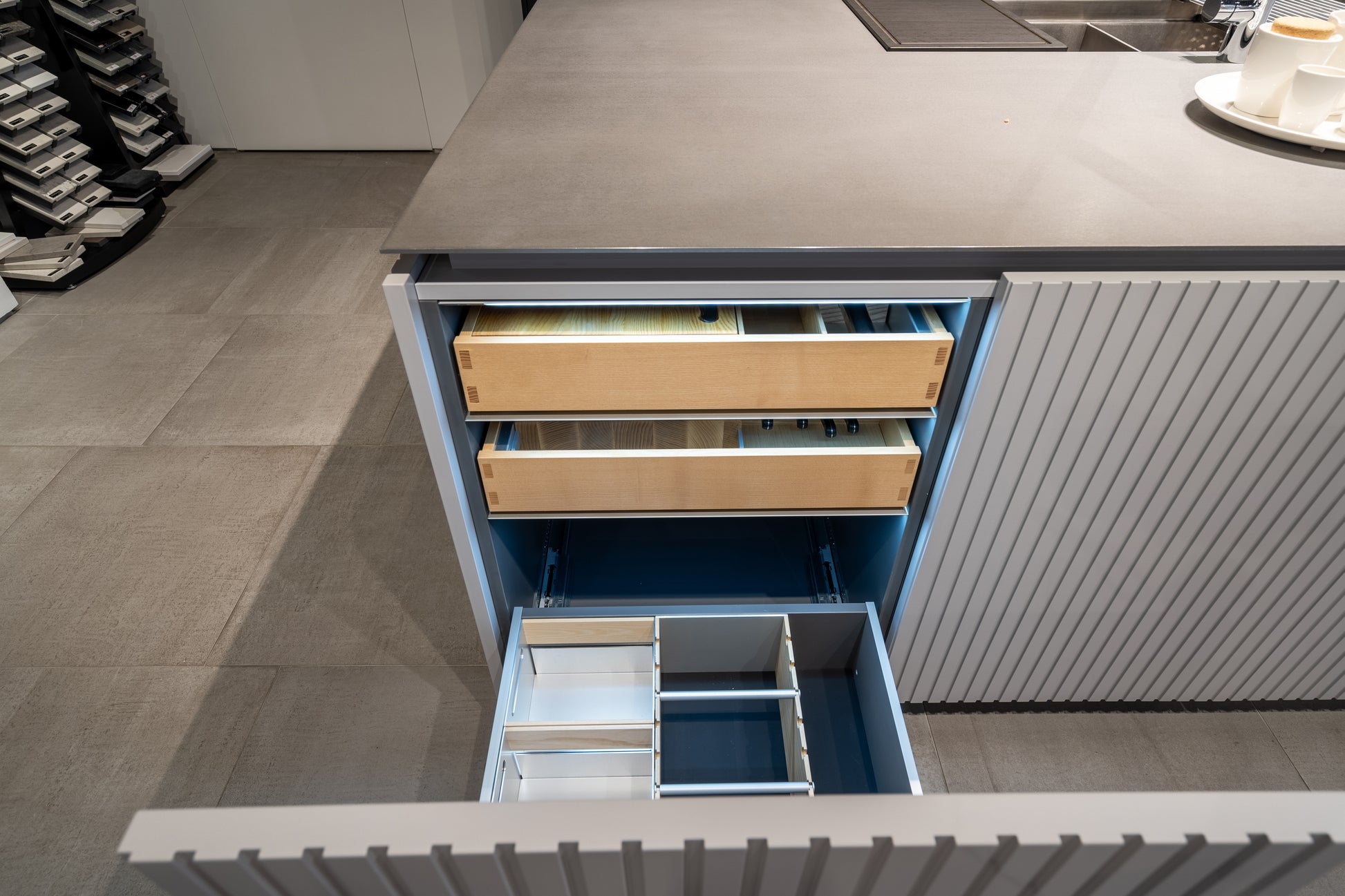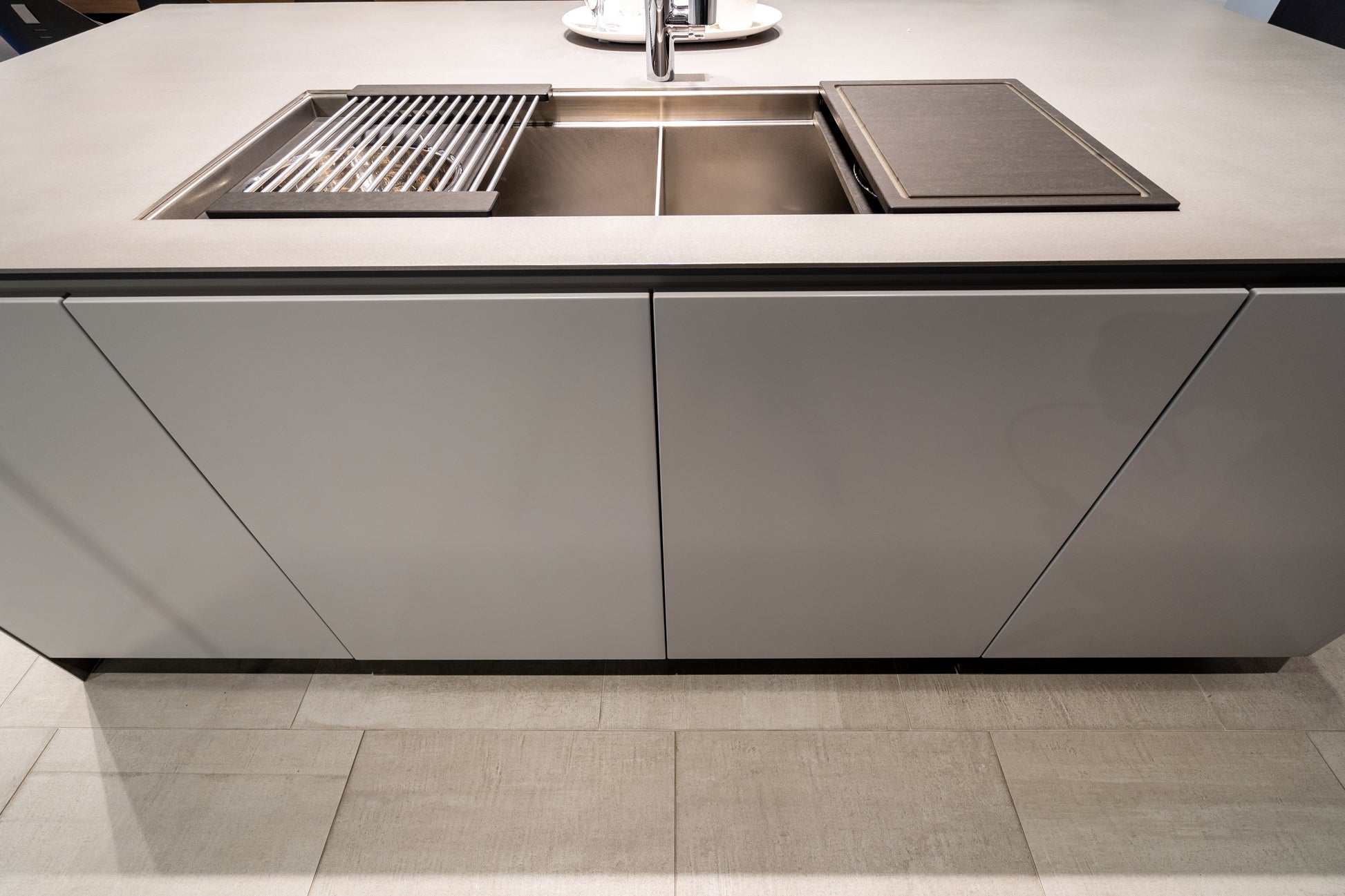 - Island Base units in Locarno Custom Light Grey Lacquer Grooved & Karat Pearl Grey Matt Lacquer & Paso Nano Pearl Grey