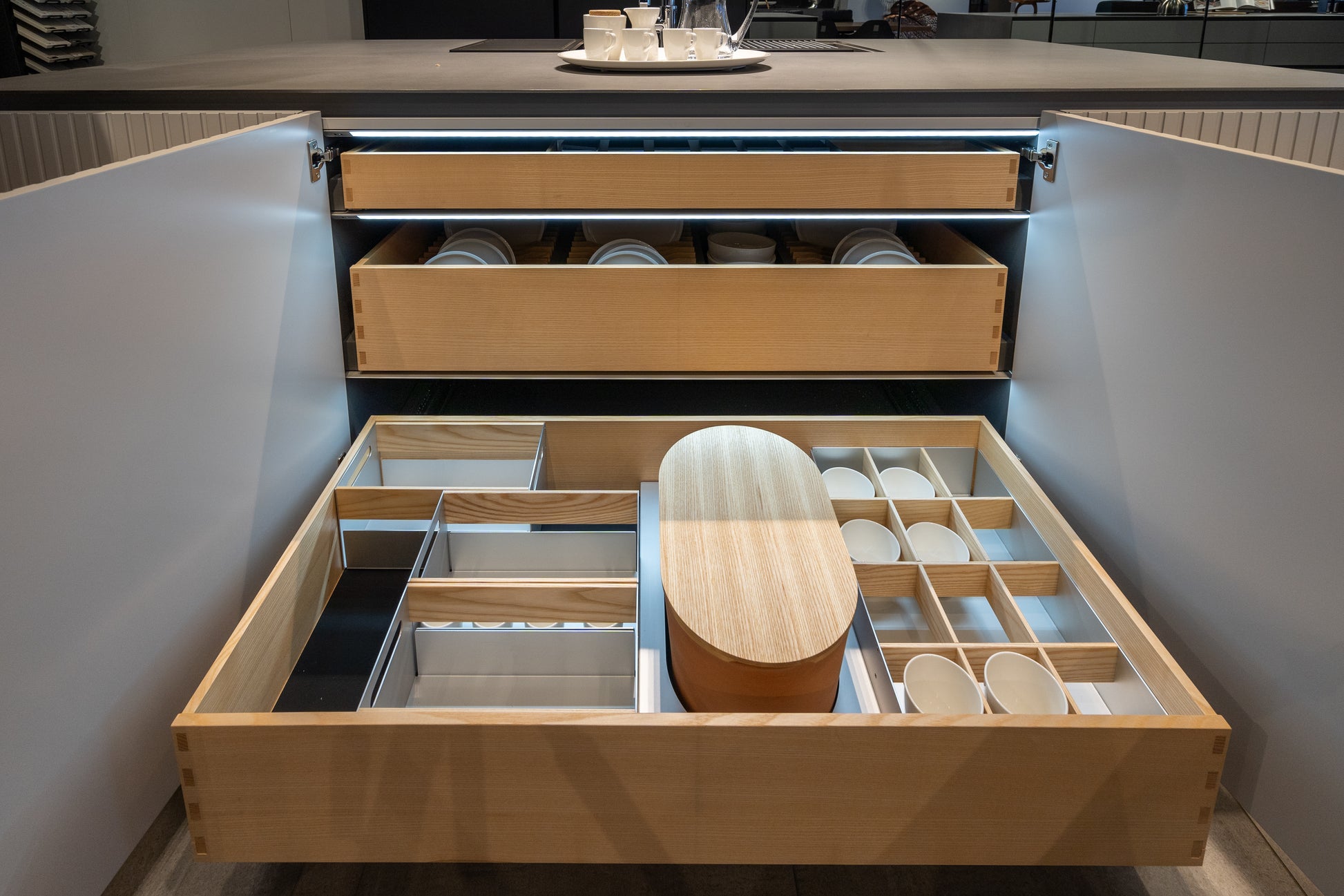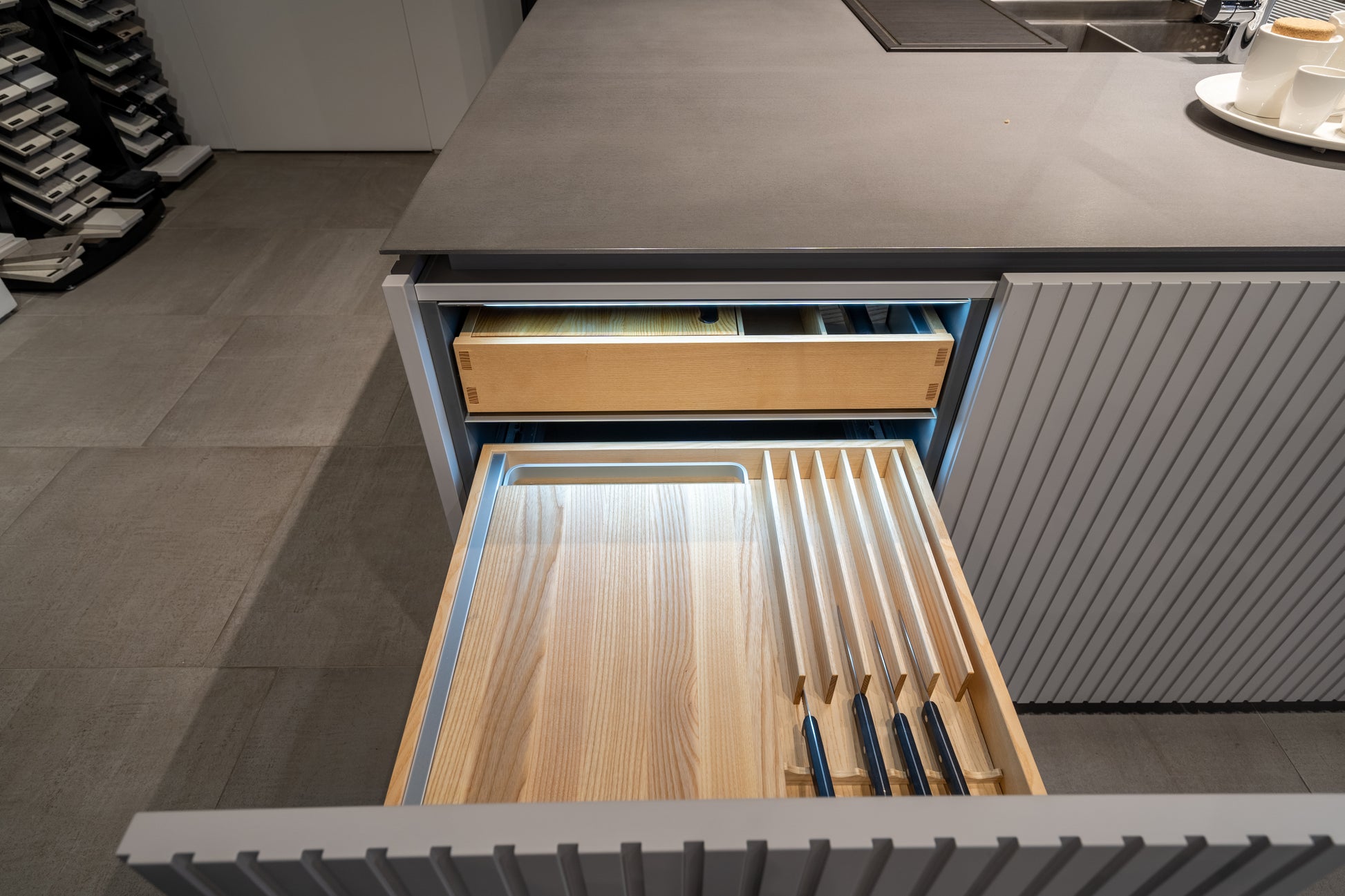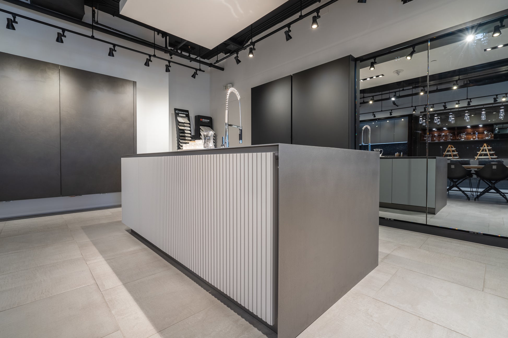 - Island Base units in Locarno Custom Light Grey Lacquer Grooved & Karat Pearl Grey Matt Lacquer & Paso Nano Pearl Grey