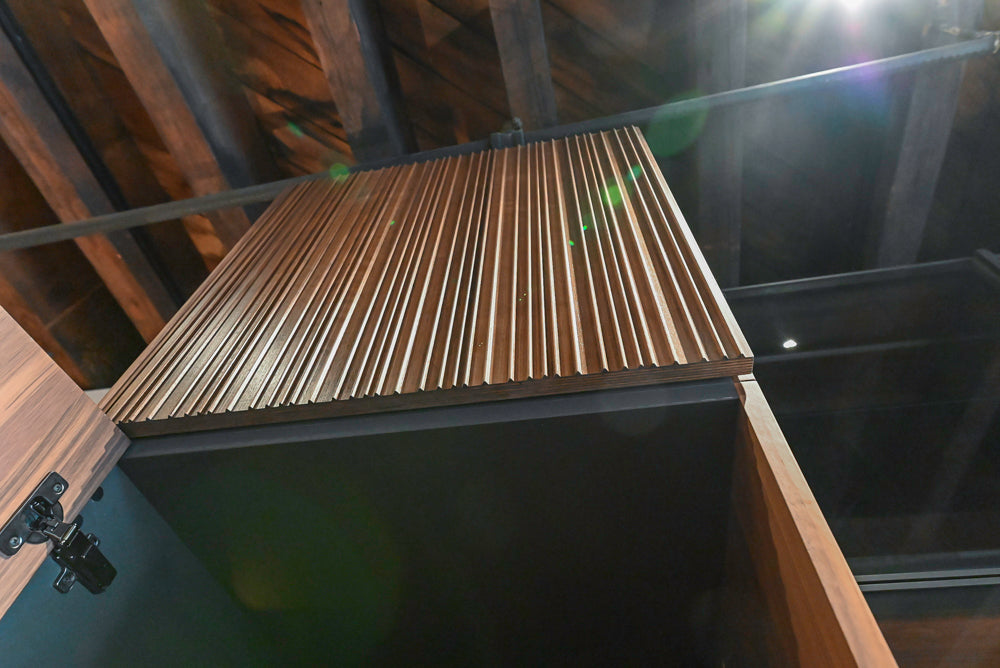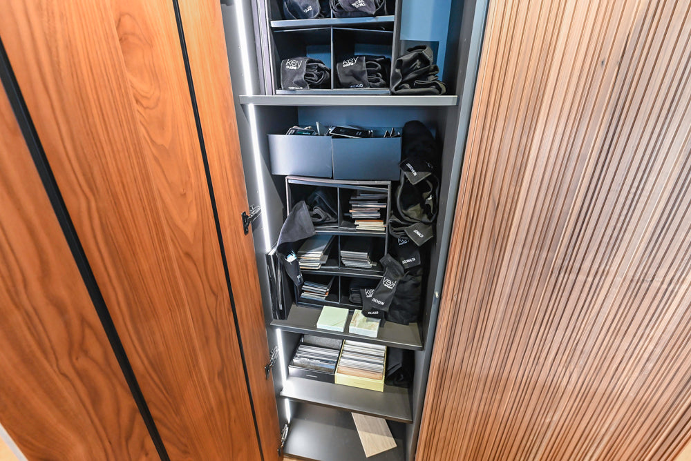 Sleek Italian design meets natural sophistication in this Key Cucine modern kitchen, featuring elegant wood-veneered cabinetry and striking Neolith stone countertops and island. Crafted with precision and attention to detail, this kitchen balances warmth and contemporary minimalism, offering a refined aesthetic that complements both open-plan and traditional layouts.