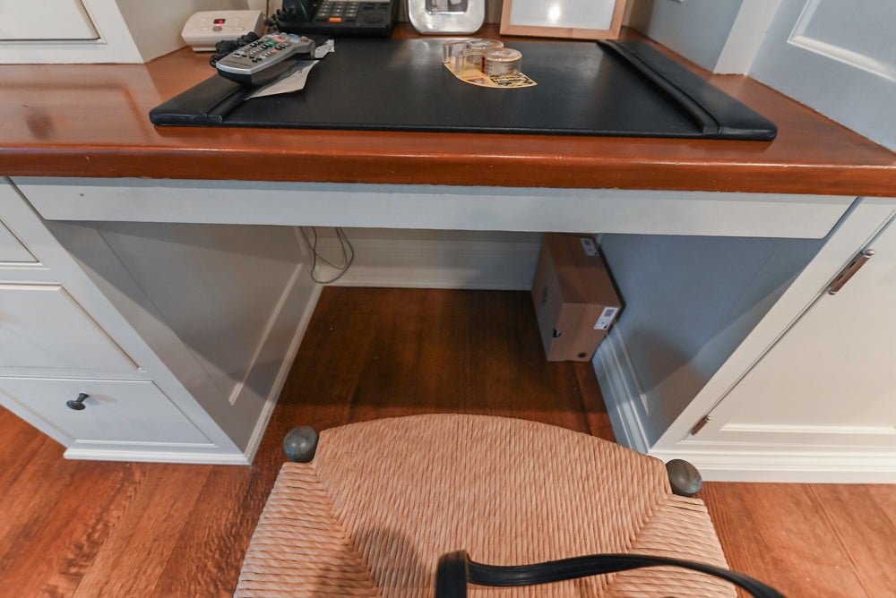 This kitchen also includes a thoughtfully designed desk area, providing a convenient space to manage household tasks, organize recipes, or simply have a quiet moment of productivity.
