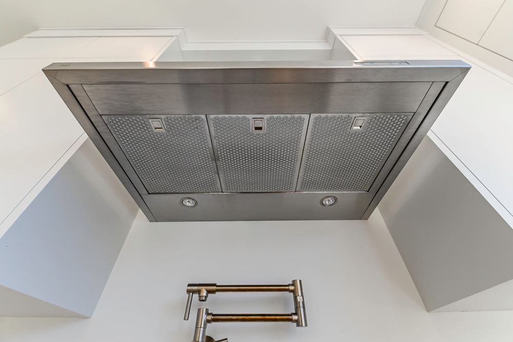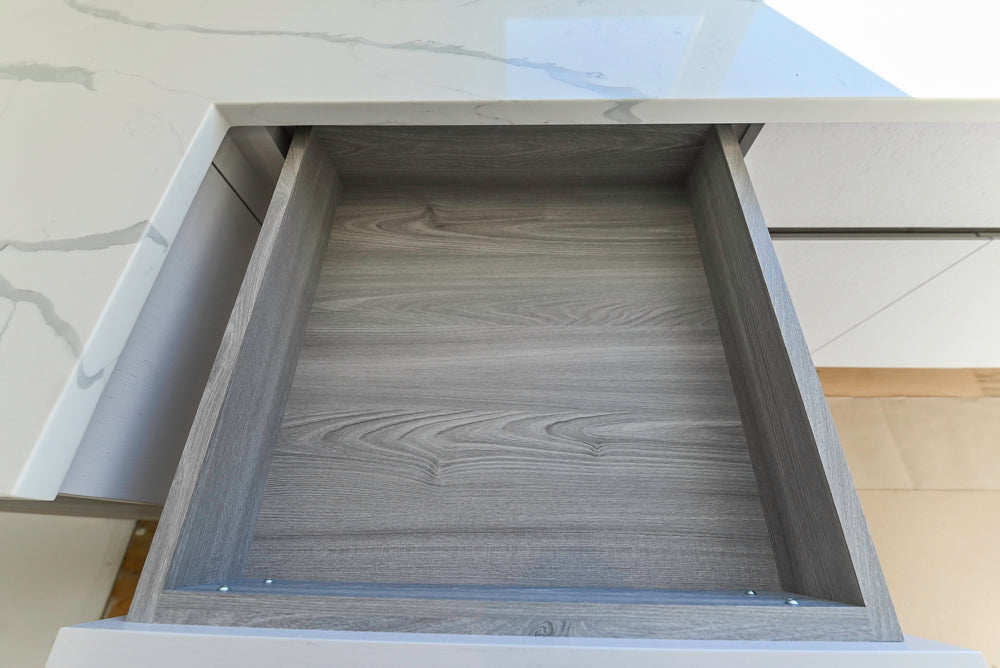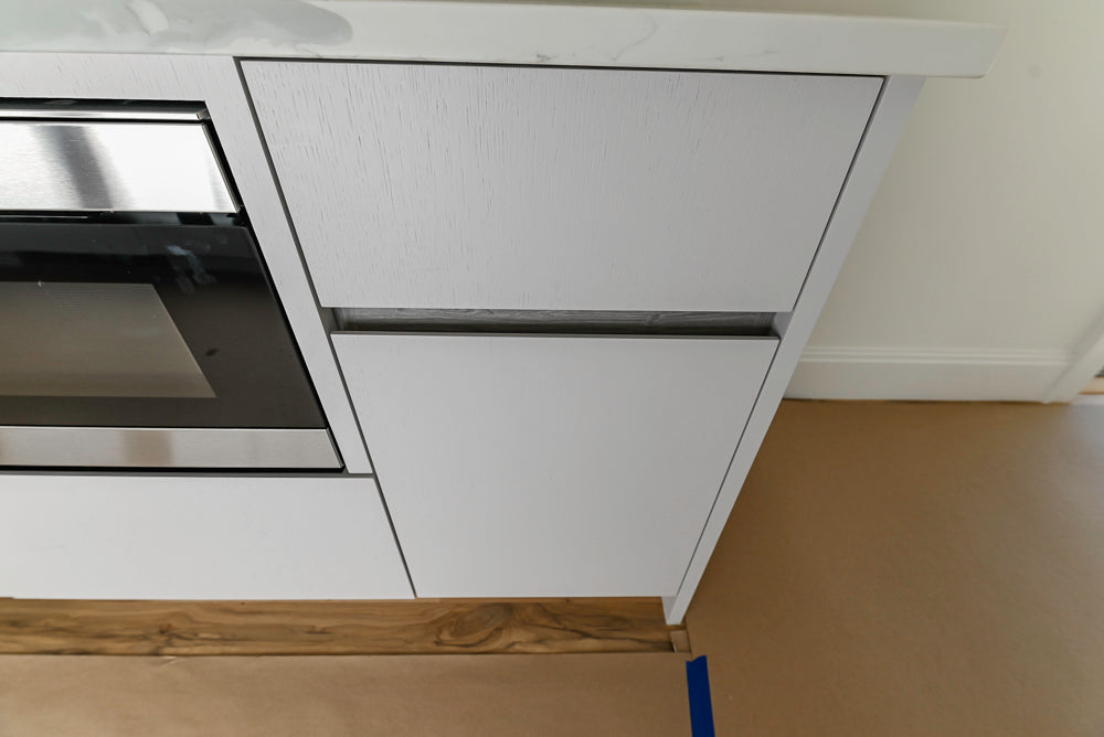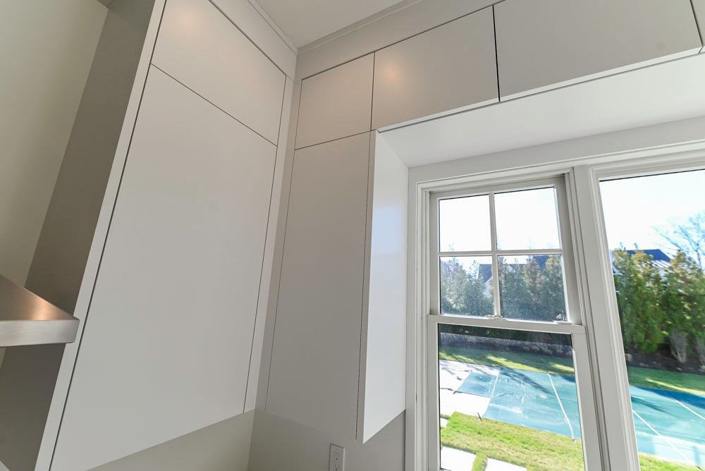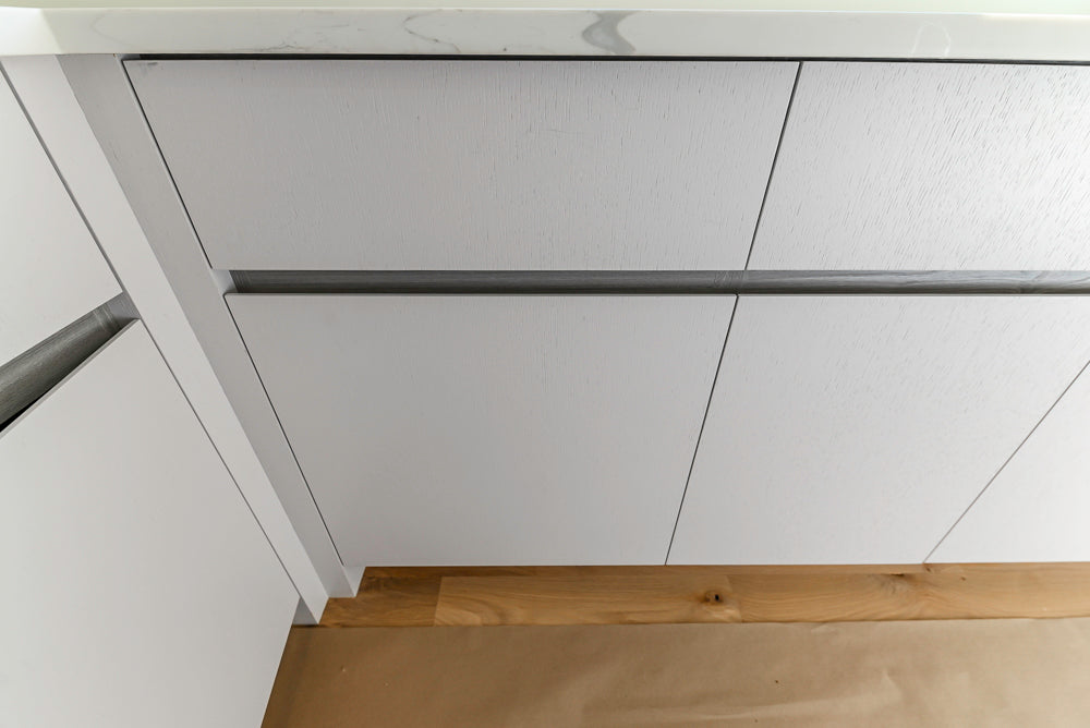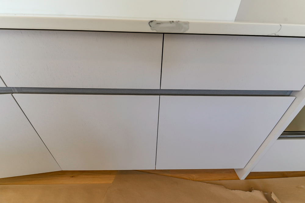 The luxurious quartz countertops further elevate the design, offering a durable and visually stunning surface. Known for its exceptional strength and resilience, quartz is resistant to scratches, stains, and heat, making it the ideal material for a high-traffic kitchen. The countertops’ smooth, polished finish and subtle veining provide a sophisticated touch that pairs beautifully with the glossy cabinetry.