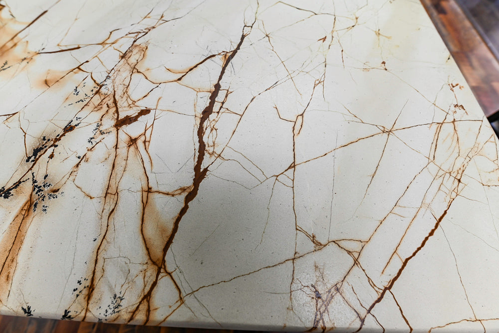 The island stands out with rich CUBITAC cabinetry topped with a stunning marble surface for a perfect blend of contrast and warmth. Paired with sleek quartz countertops along the perimeter, this layout offers both form and function in a compact, transitional design.