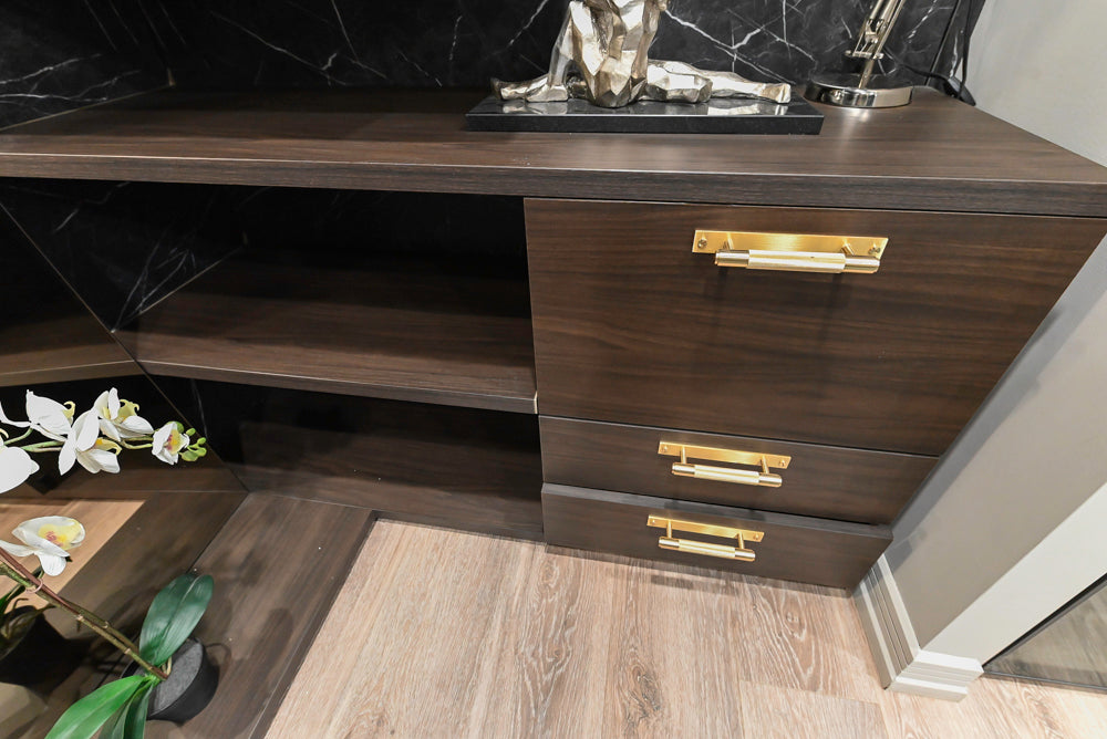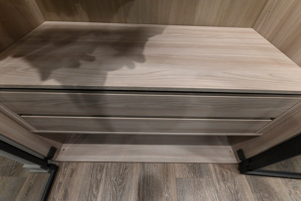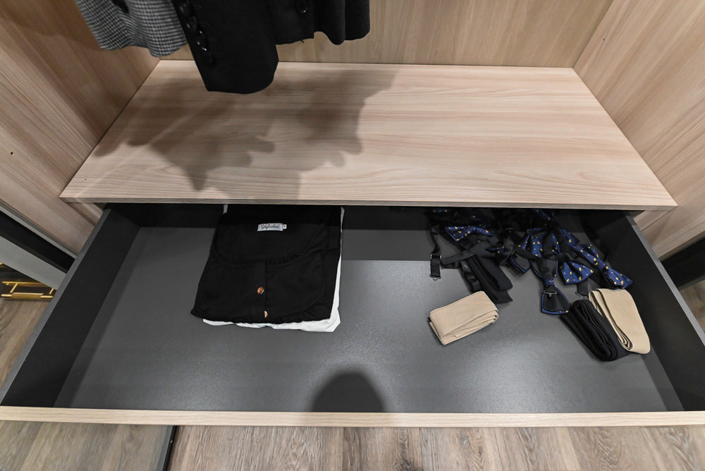 The system is thoughtfully designed with a mix of open shelving, hanging space, and drawers, allowing for organized storage and easy access to your essentials. Ideal for bedrooms, dressing rooms, or walk-in closets, it balances form and function, offering a minimalist yet highly functional solution for stylish storage.
