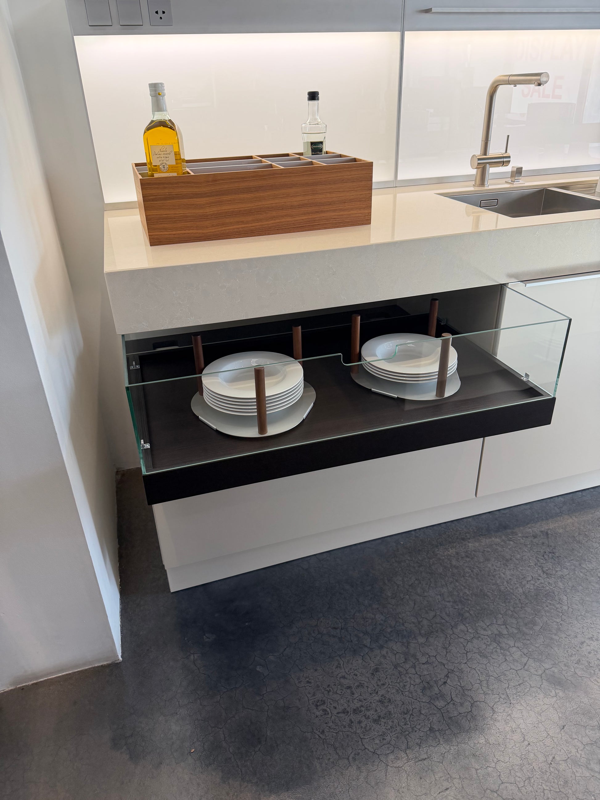 All kitchen components are sold strictly "as-is" regarding their configuration and fit. Please be aware that in showroom displays, components like sinks, cooktops, and appliances may be fitted into custom-cut openings that do not follow standard residential sizing.