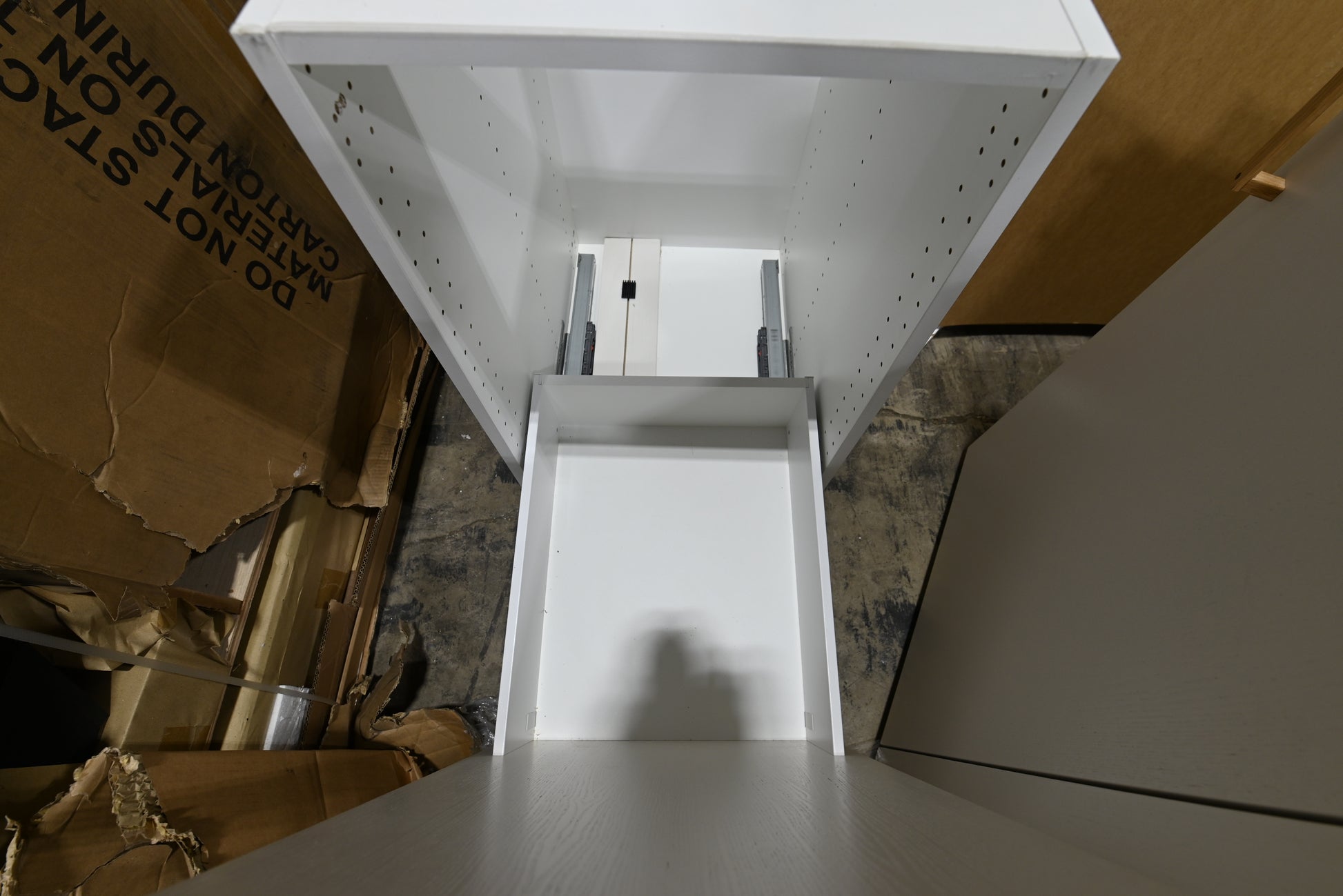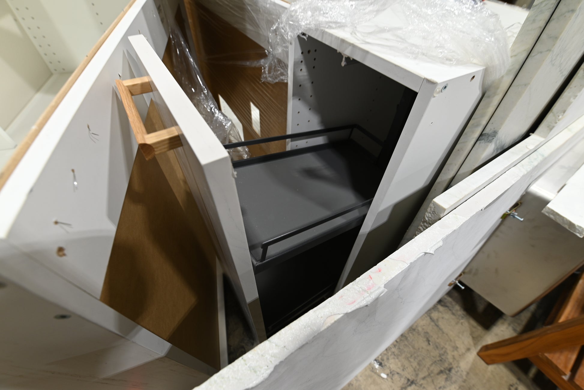 The crisp white cabinetry creates a clean, contemporary aesthetic, while the marble countertop adds elegance and durability for everyday use. The included sink and faucet provide a complete, turnkey solution, ready for installation. Thoughtfully designed partial cabinets offer essential storage and countertop space, making this modern kitchen setup ideal for smaller spaces, secondary kitchen areas, or elegant kitchenette designs.
