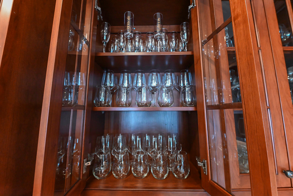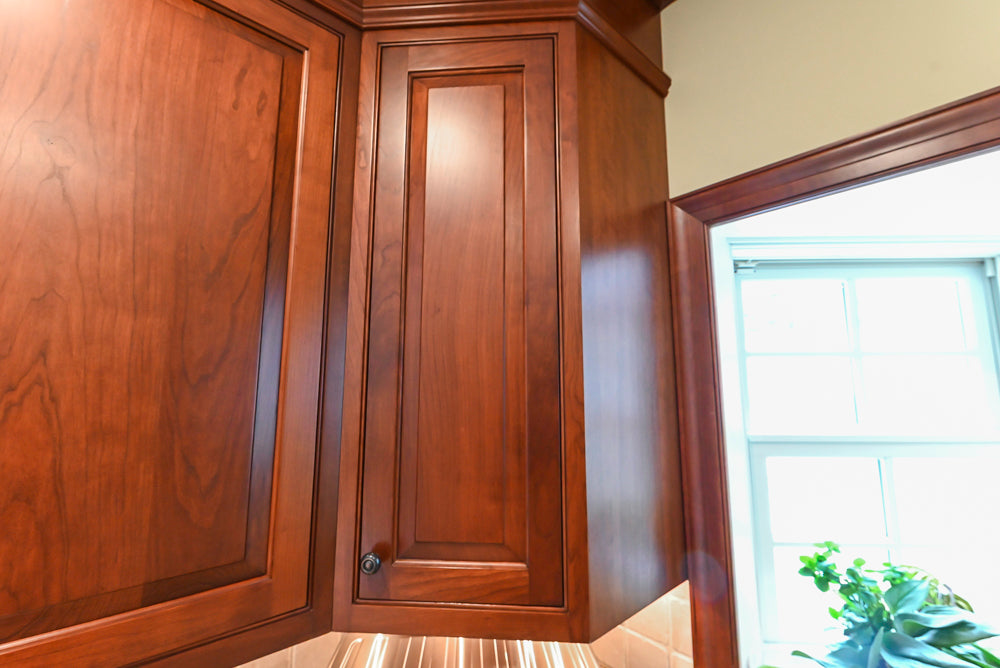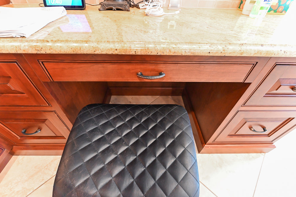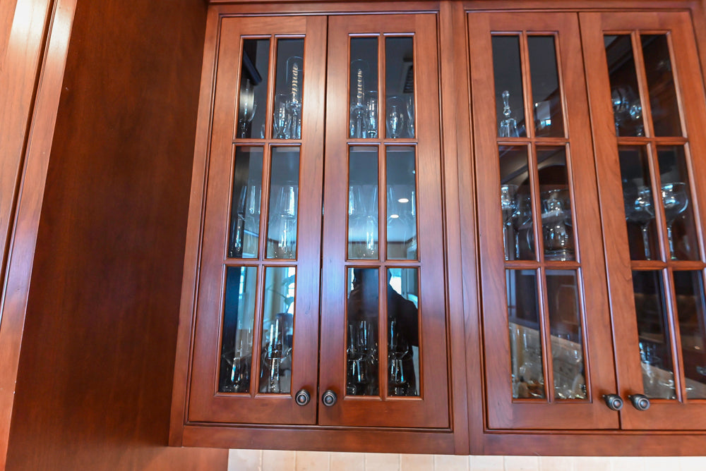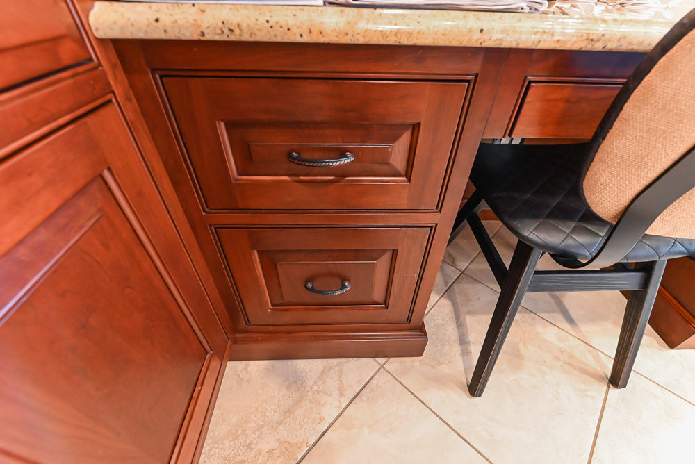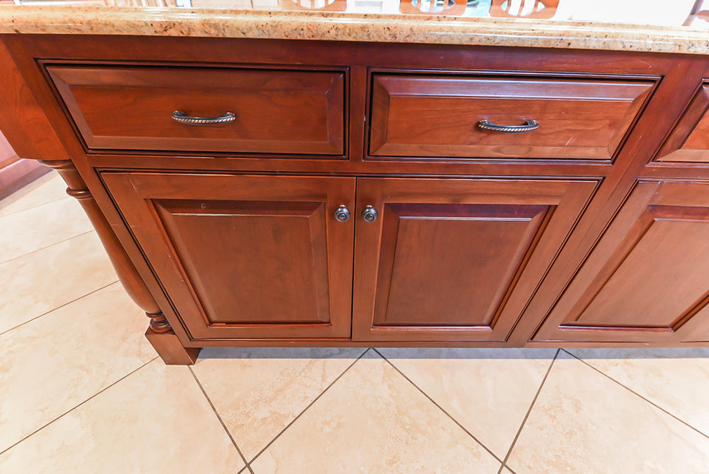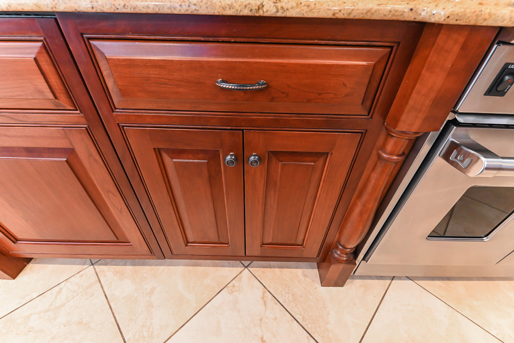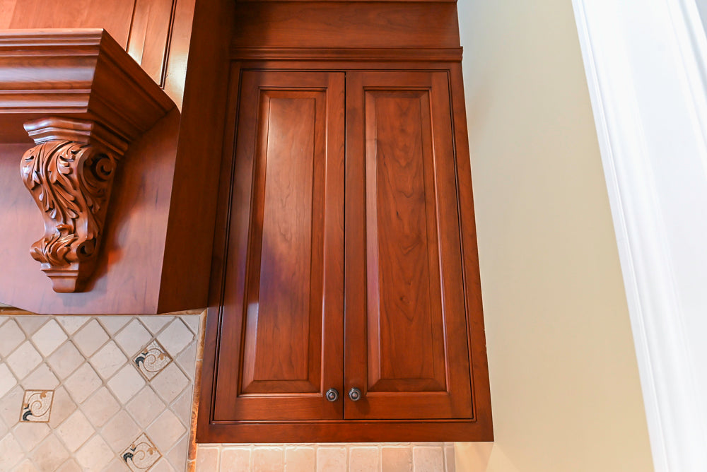 The Winchester Estate Traditional Kitchen is a timeless showcase of craftsmanship and warmth. Rich cherry cabinetry with raised panel detailing and crown molding creates a stately presence, while expansive granite countertops offer both durability and visual impact. The oversized island serves as the heart of the kitchen, featuring carved decorative accents, ample prep space, and integrated beverage refrigeration—perfect for gathering, entertaining, and everyday living.