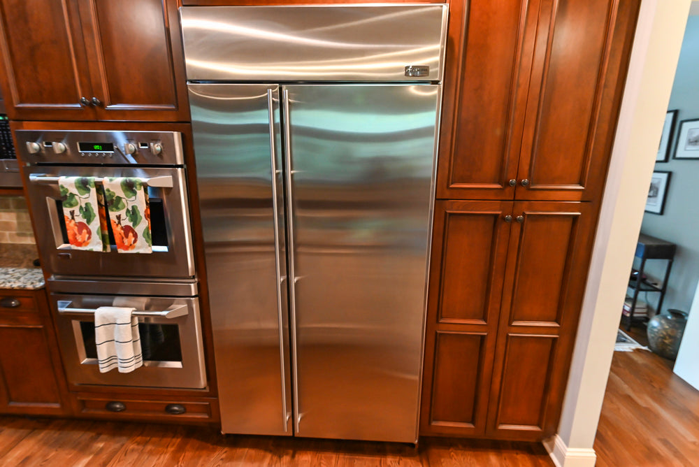 At the heart of the design is a spacious island, perfect for meal prep, casual dining, or entertaining guests. Paired with state-of-the-art appliances seamlessly integrated into the cabinetry, this kitchen is as practical as it is beautiful. Each element has been meticulously chosen to create a cohesive look that honors traditional craftsmanship while accommodating today’s lifestyle.