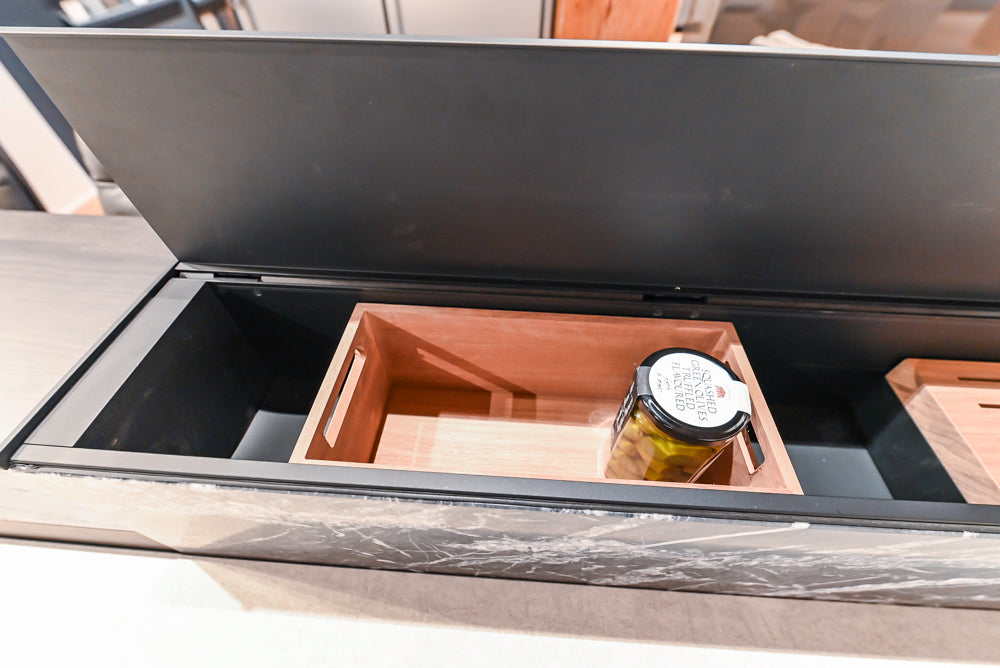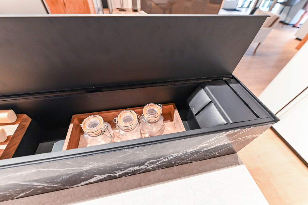 Beauty and function are perfectly combined in this kitchen which features a whole wall of Valcucine’s New Logica special element.Lower the white glass backsplash and lift the patented counterweighted upper door to reveal the perfect hidden workspace filled with functional accessories like rotating spice racks, plug strips for small appliances, a pot filler, integrated hood vent, utensil rails with paper towel holder, a tablet stand and drying rack. The back panel ofNew Logica is illuminated giving the kitchen a wonderful glow.