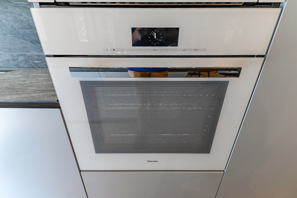 This kitchen seamlessly combines two lines from Valcucine. Wall cabinetry is Forma Mentis featuring the signature angled edge and angled Cardoso stone top with Matt Lacquered fronts. The Aerius wall unit opens with Valcucine’s patented counterweight and is finished in White “Butterfly Wing” tactile glass in a beautiful and subtle pattern.