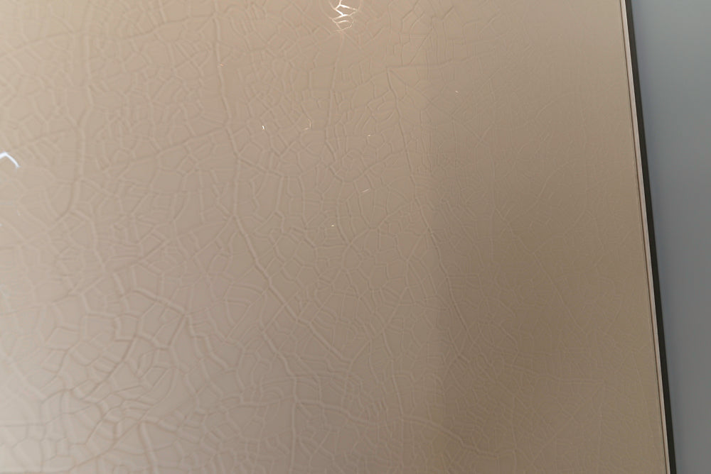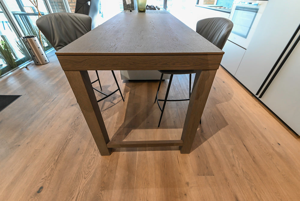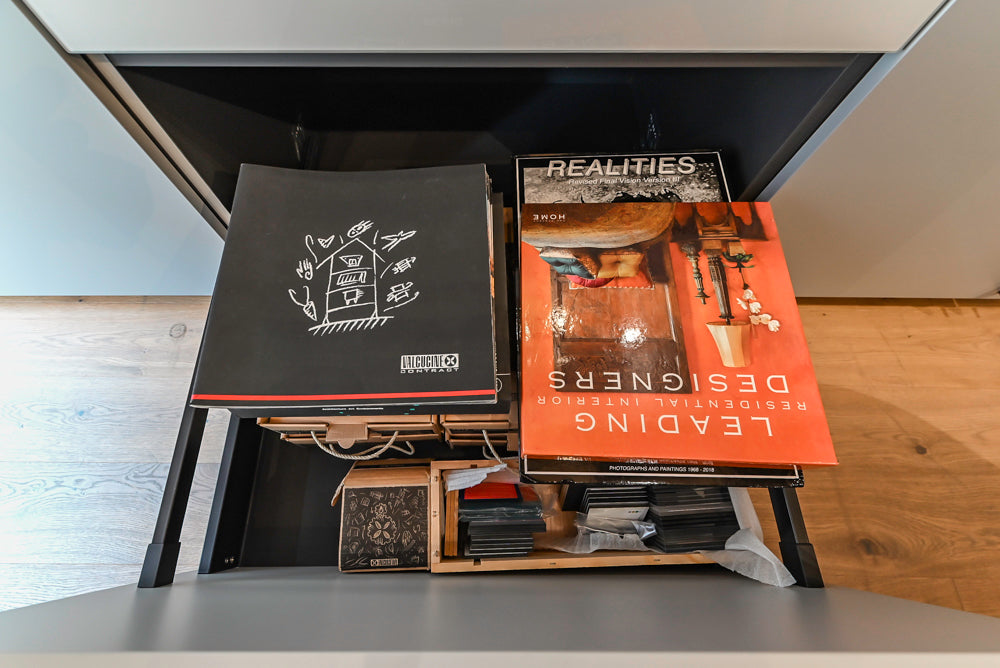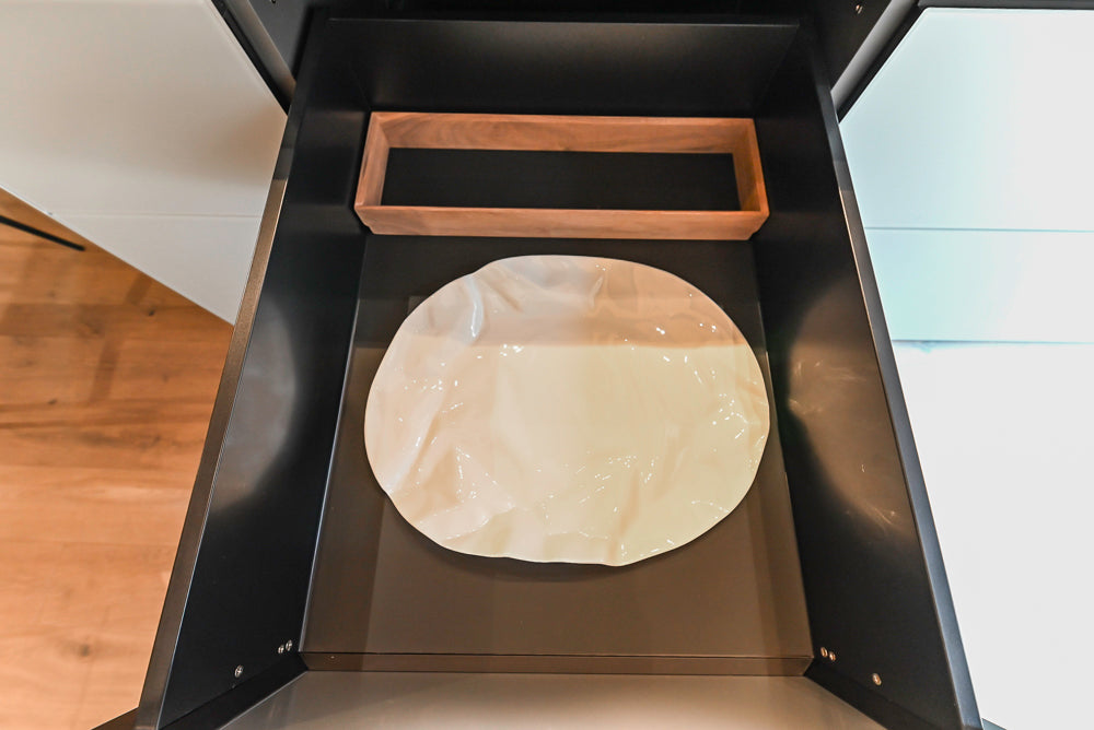 The Island features the Genius Loci “hidden” drawer in Cardoso stone to match the top which seamlessly transitions to a Burnished Oak table complete with matching “hidden” drawers. The island is finished on all sides in Matt Glass. Behind the unique Foster cooktop is Logica Theca, a box with lift-up door that reveals a hidden storage space for outlets, spices and chopping boards.