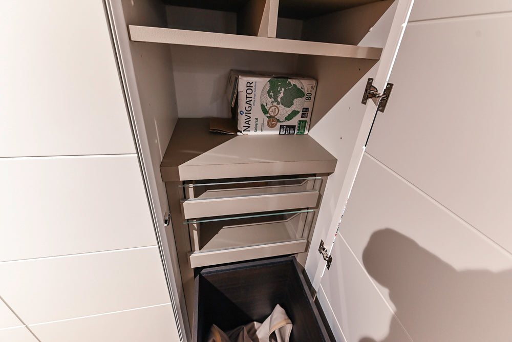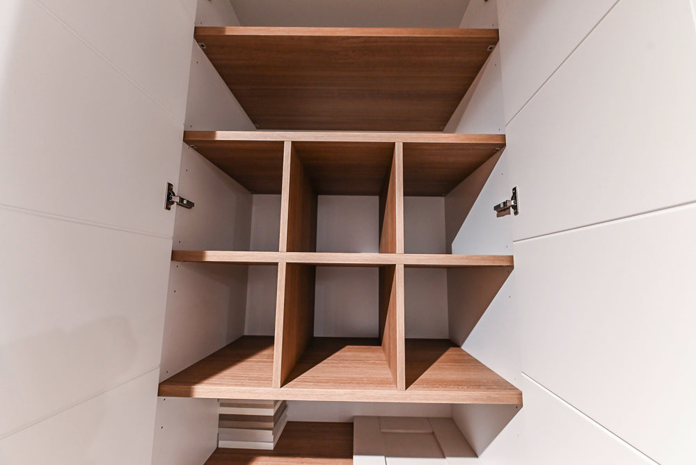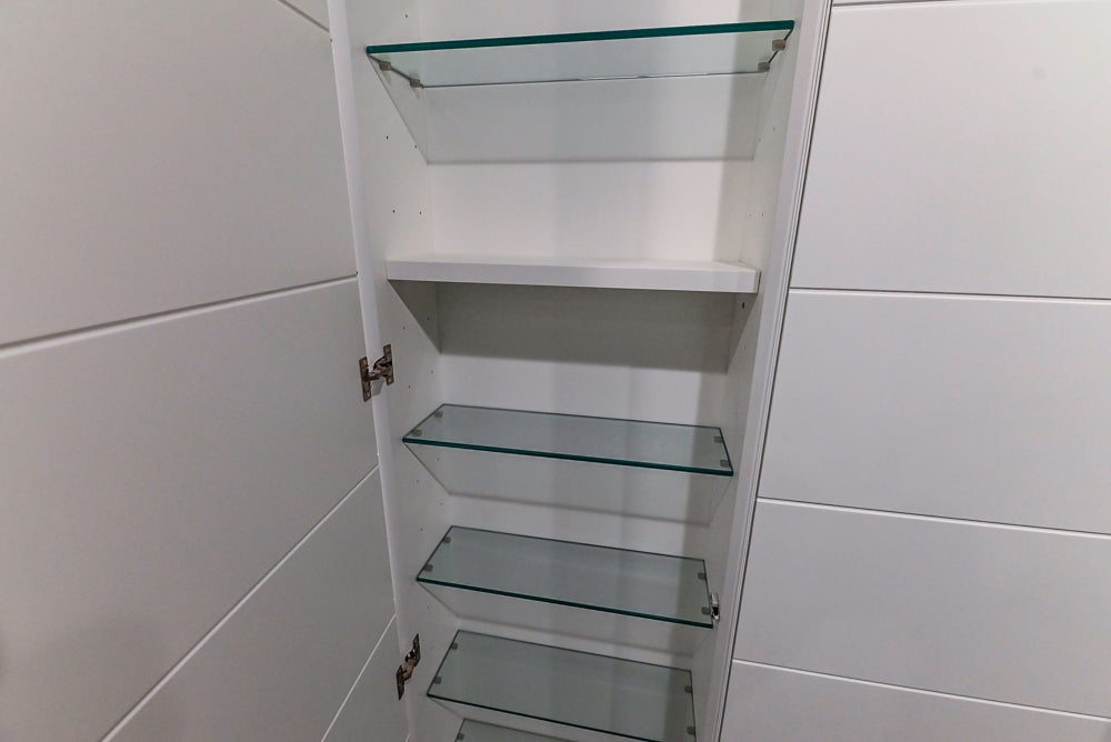 The spacious vanity offers generous counter space and integrated cabinetry, while the coordinating wardrobe system provides ample room for linens, accessories, and essentials.