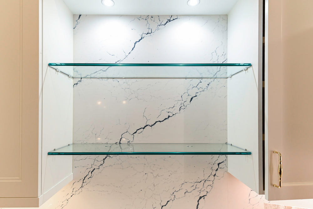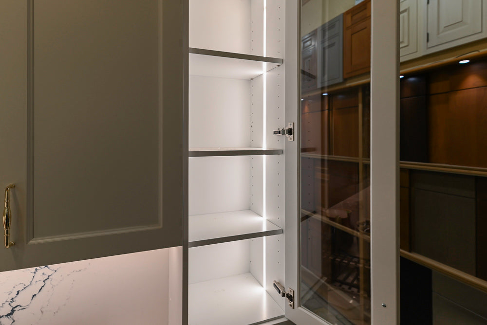 The rich navy cabinets provide a striking contrast to the bright, airy tones of the white cabinetry, creating a dynamic two-tone effect that adds depth and visual interest. The traditional design is enhanced with exquisite detailing, including finely crafted molding, custom storage solutions, and thoughtfully designed shelves, providing both style and functionality.